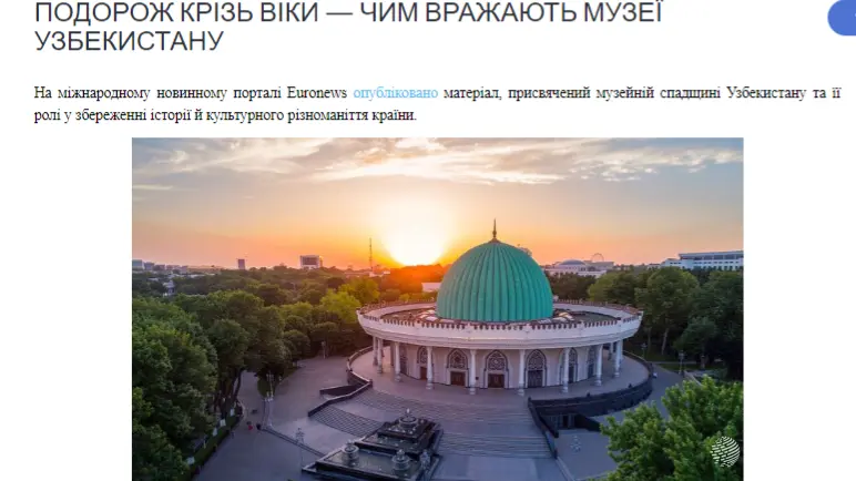 КИЕВ, 4 апреля. /ИА «Дунё»/. Телеканал «Euronews» опубликовал материал, посвящённый музеям Узбекистана и их роли в сохранении историко-культурного наследия страны, сообщает корреспондент ИА «Дунё» со ссылкой на журнал «Kyiv Diplomatic».