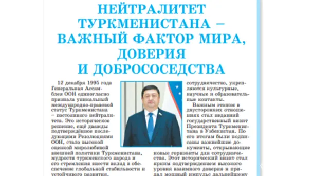 АШХАБАД, 22 декабря. /ИА «Дунё»/. В центральной государственной газете «Нейтральный Туркменистан» опубликована статья посла Узбекистана Равшанбека Алимова, посвящённая 30-летию постоянного нейтралитета Туркменистана и современному состоянию узбекско-туркменских отношений, сообщает корреспондент ИА «Дунё».