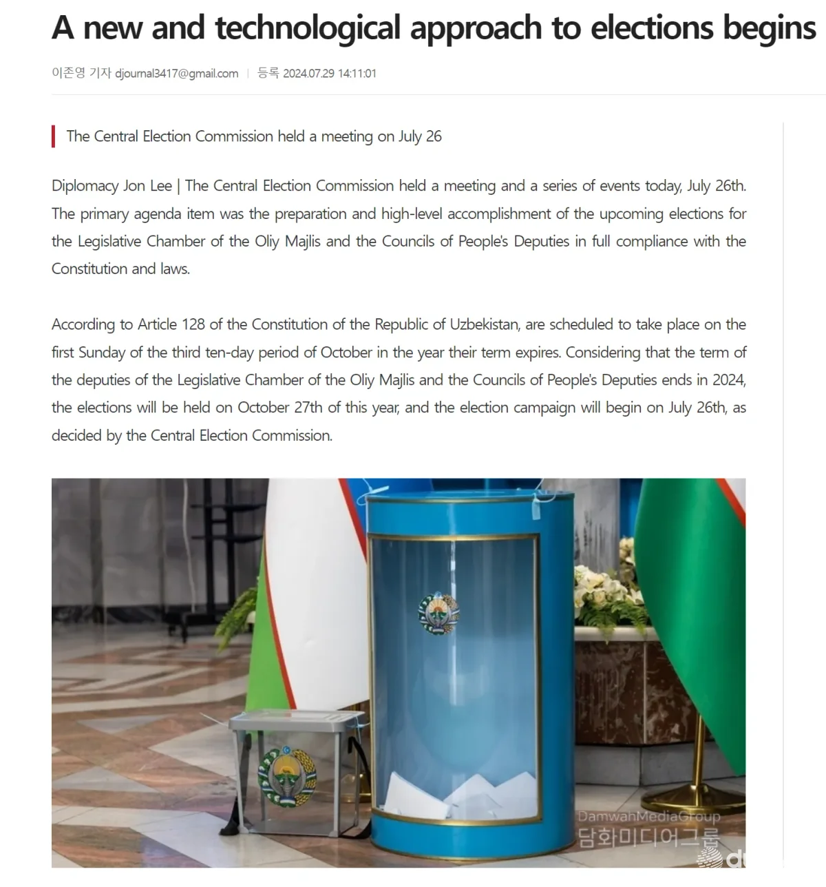 СЕУЛ, 29 июля. /ИА “Дунё”/. В ведущем южнокорейском издании «Diplomacy Journal» опубликована статья о старте в Узбекистане избирательной кампании по выборам в парламент страны, которые пройдут в октябрпе этого года, сообщает корреспондент А “Дунё”.