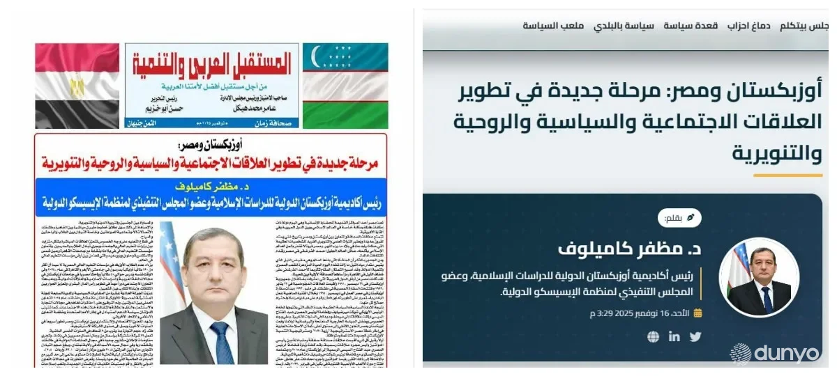 QOHIRA, 21-noyabr. /"Dunyo" AA/. Misrning nufuzli "Mobtada" va "5-seyasa" OAVda O'zbekiston xalqaro islomshunoslik akademiyasi rektori, ICESCO tashkiloti Ijroiy kengashi a'zosi Muzaffar Kamilovning "O'zbekiston va Misr: ijtimoiy-siyosiy, ma'naviy-ma'rifiy aloqalar rivojida yangi davr" sarlavhali maqolasi e'lon qilindi, deb xabar bermoqda "Dunyo" AA muxbiri.