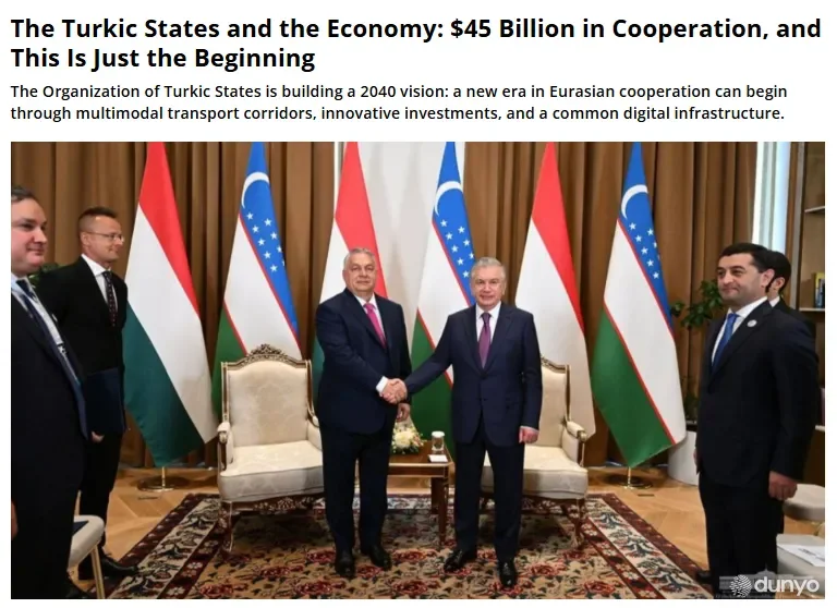 BUDAPESHT, 21-may. /"Dunyo" AA/. Vengriyaning yetakchi "Mandiner" elektron nashrida "Turkiy davlatlar va iqtisodiyot: hamkorlikda 45 milliard dollar va bu hali boshlanishi" sarlavhali maqola e'lon qilindi, deb xabar qilmoqda "Dunyo" AA muxbiri.