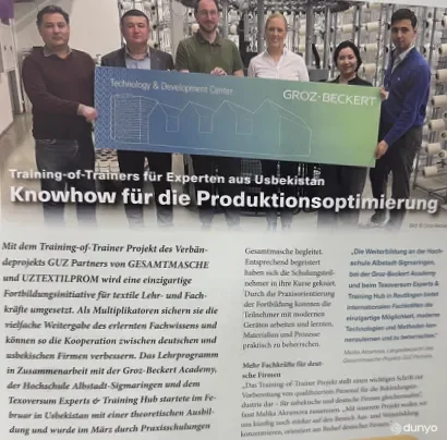 Maqolada joriy yilning fevral-mart oylarida "Gesamtmasche" Germaniya tekstil va trikotaj kompaniyalari uyushmasi va "O'zto'qimachiliksanoati" uyushmasining "GUZ Partners" qo'shma loyihasi doirasida o'zbekistonlik tekstil sanoati mutaxassislari uchun malaka oshirish kurslari tashkil qilingani ma'lum qilingan.