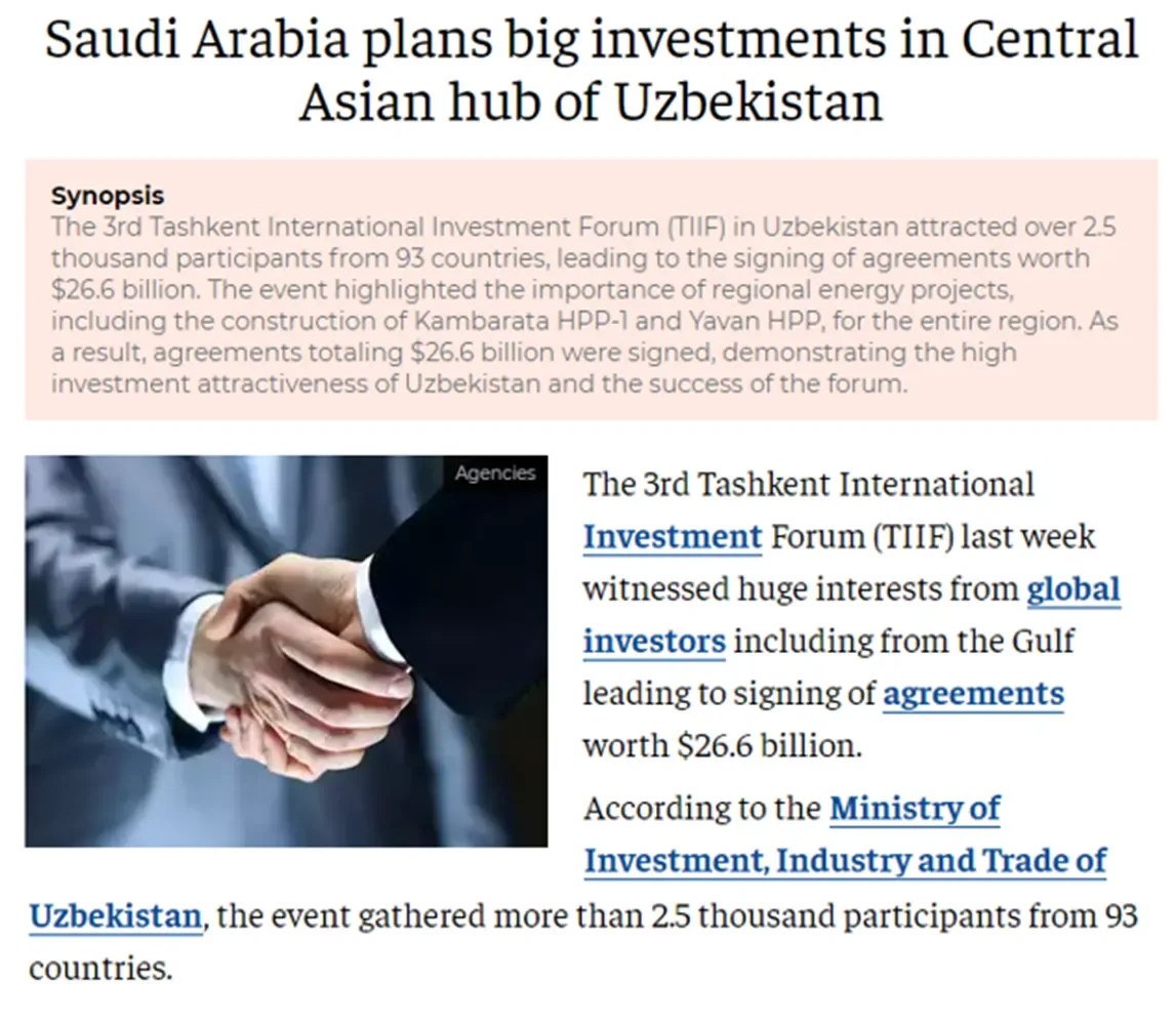 "Uchinchi Toshkent xalqaro investitsiya forumi global sarmoyadorlar, jumladan, Fors ko'rfazi mamlakatlari vakillarida katta qiziqish uyg'otdi va buning natijasida umumiy qiymati 26,6 milliard dollarlik shartnomalar imzolandi. Xalqaro tadbir o'z maydonlarida 93 mamlakatdan 2,5 mingdan ortiq ishtirokchini jamladi. Erishilgan kelishuvlar O'zbekistonning yuksak sarmoyaviy jozibadorligi va forum muvaffaqiyatidan dalolat beradi", deb ta'kidlangan maqolada.