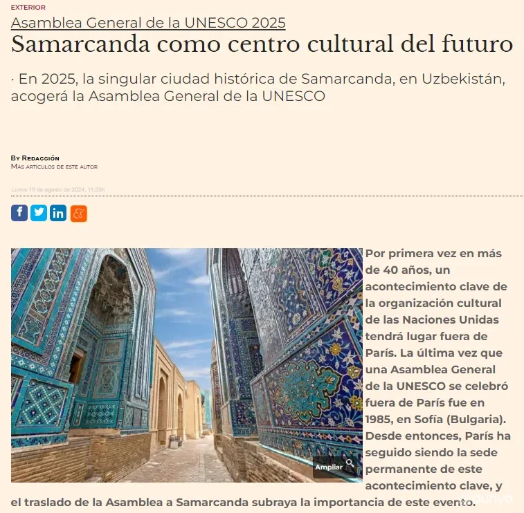 MADRID, 20-avgust. /"Dunyo" AA/. Ispaniyaning yetakchi "El Mundo Financiero" elektron nashrida Samarqandda bo'lib o'tadigan YUNESKO Bosh konferensiyasining 43-sessiyasiga bag'ishlangan maqola e'lon qilindi, deb xabar bermoqda "Dunyo" AA muxbiri.