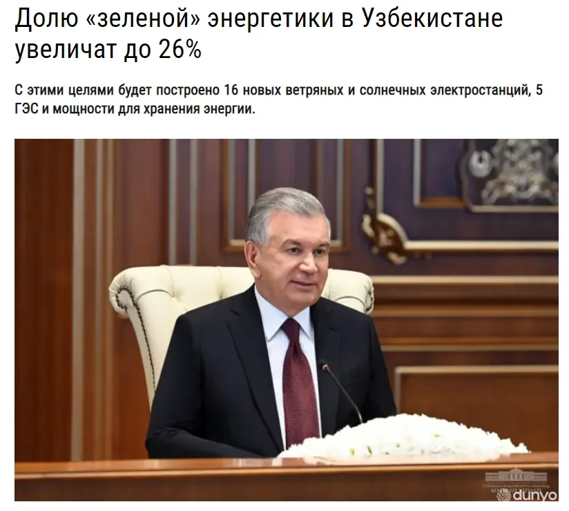 "2025-yilda mamlakat energetika tizimida "yashil" energiya ulushini hozirgi 16 foizdan 26 foizga yetkazish rejalashtirmoqda. Buning uchun yana 3,5 gigavattli 16 ta yirik quyosh va shamol stansiyaci, 160 megavattli 5 ta yirik GES va 1,8 gigavattli energiya saqlash quvvatlari ishga tushiriladi", – deb yozadi "SNG.Today".