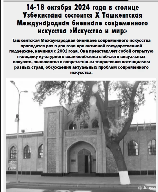 MOSKVA, 28-iyun. /"Dunyo" AA/. Rossiyaning "Argumenti nedeli" gazetasida "O'zbekiston poytaxtida X Toshkent xalqaro zamonaviy san'at biyennalesi "San'at va dunyo" mavzusida o'tkaziladi" sarlavhali maqola chop etildi, deb xabar bermoqda "Dunyo" AA muxbiri.