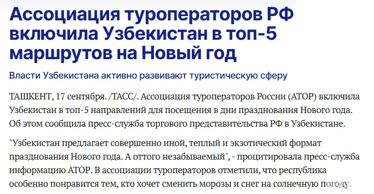 MOSKVA, 22-sentabr. /"Dunyo" AA/. Rossiya turoperatorlari assotsiatsiyasi (ATOR) O'zbekistonni Yangi yil bayrami arafasida rossiyaliklar uchun eng yaxshi beshta yo'nalishdan biri sifatida e'tirof etdi, deb xabar qilmoqda "Dunyo" AA muxbiri.