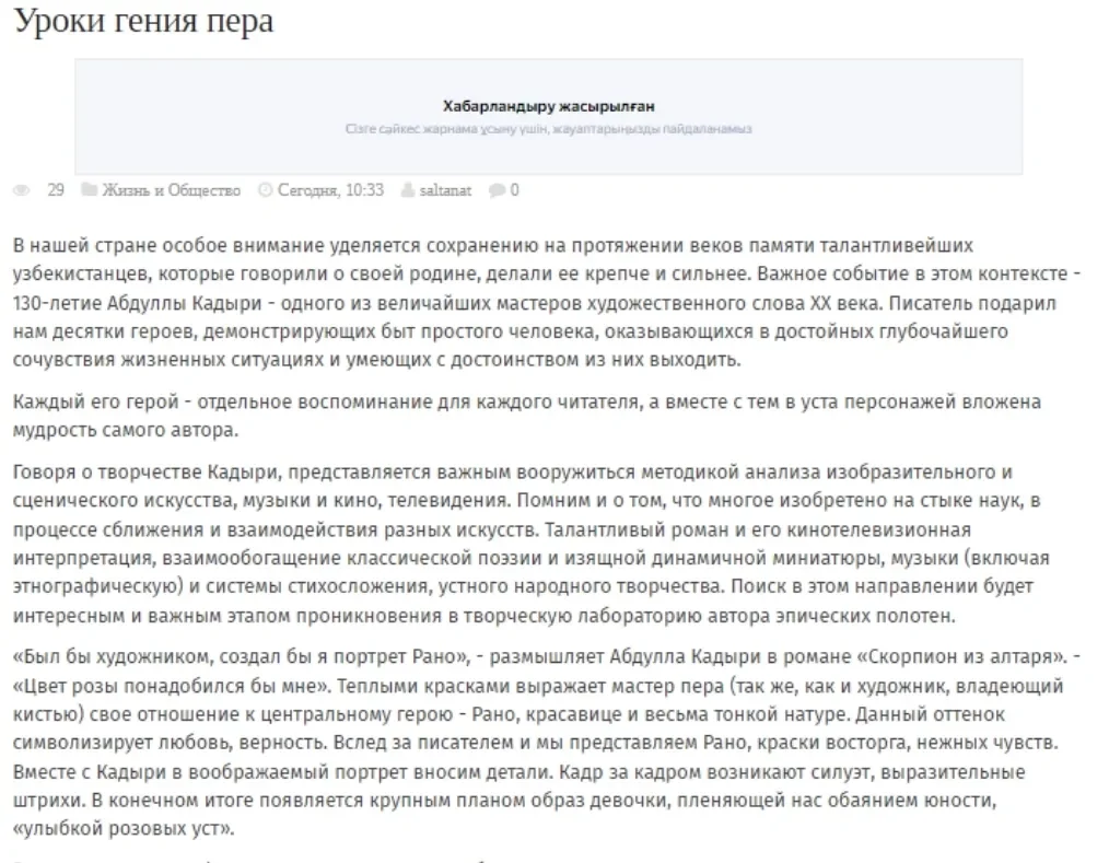 OSTONA, 17-aprel. /Dunyo"/. Qozog'istonning "Infozakon" elektron nashrida XX asr o'zbek adabiyotining yetuk vakillaridan biri — Abdulla Qodiriy asarlari va ular asosida yaratilgan filmlarga bag'ishlangan maqola e’lon qilindi, deb xabar bermoqda "Dunyo" AA muxbiri.