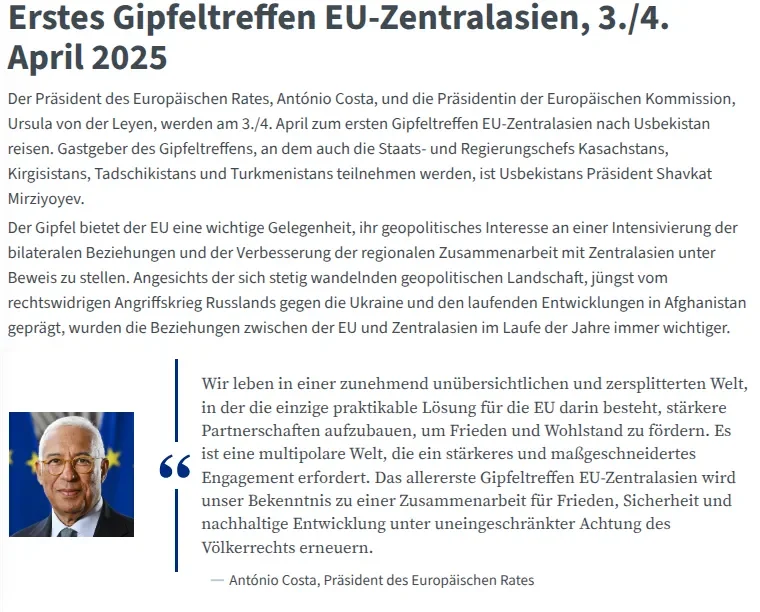 BERLIN, 1-aprel. /"Dunyo" AA/. Yevropa Ittifoqi Kengashi rasmiy veb-saytida joriy yilning 3-4-aprel kunlari Samarqand shahrida bo'lib o'tadigan "Markaziy Osiyo – Yevropa Ittifoqi" birinchi sammitiga bag'ishlangan maqola qilindi, deb xabar bermoqda "Dunyo" AA muxbiri.