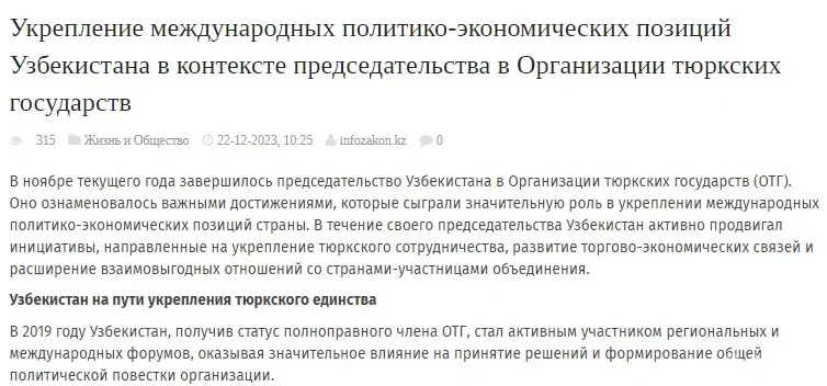 OLMAOTA, 25-dekabr. /"Dunyo" AA/. Qozog'istonning "Infozakon" onlayn nashrida O'zbekistonning Turkiy davlatlar tashkilotiga raisligi yakunlariga bag'ishlangan maqola e'lon qilindi, deb xabar bermoqda "Dunyo" AA muxbiri.