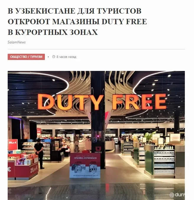 «Xorijiy sayyohlar uchun O'zbekistondagi kurort zonalarda duty free do'konlari ochiladi. U yerdagi savdo avtomatlaridan qimmatbaho metall sotib olish mumkin bo'ladi, – deb yozadi axborot portali. – Qayd etilishicha, O'zbekiston Prezidenti «Respublikaning turizm salohiyatini jadal rivojlantirish hamda mahalliy va xorijiy turistlar sonini yanada oshirishga doir qo'shimcha chora-tadbirlar to'g'risida»gi qarorni imzolagan. Shunday qilib, boj olinmaydigan savdo do'konlari (duty free) hamda mashhur xalqaro brendlarning chakana savdo do'konlaridan iborat yirik savdo majmualari (Luxury tourism village) quriladi».
