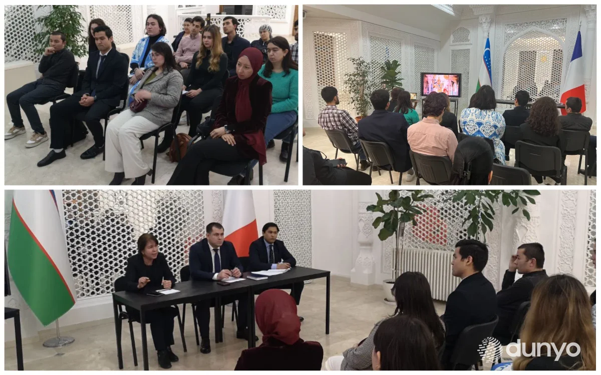 Tadbir ishtirokchilariga mamlakatimizda ta'lim sohasida amalga oshirilayotgan islohotlar, O'zbekistonda yoshlarga oid davlat siyosati hamda O'zbekiston-Fransiya hamkorligi haqida atroflicha ma'lumot berildi.