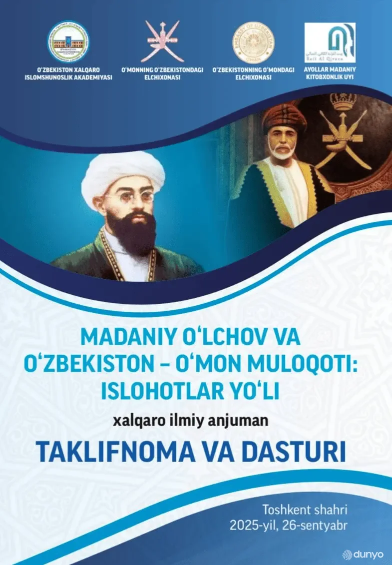 MASQAT, 25-sentyabr. /"Dunyo" AA/. 26-sentyabr kuni Toshkentda "Madaniy o'lchov va O'zbekiston-O'mon muloqoti: islohotlar yo'li" mavzusida ilmiy konferensiya bo'lib o'tadi, deb xabar qilmoqda "Dunyo" AA muxbiri.