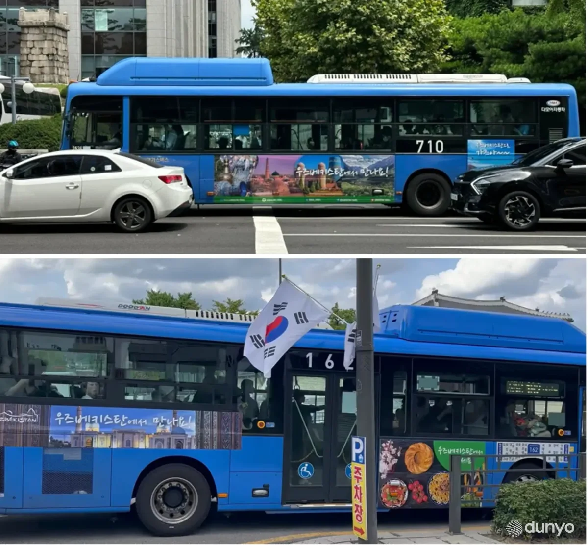 Seulning markaziy ko'chalarida O'zbekistonning tarixiy binolari tasviri tushirilgan avtobuslar harakatlanmoqda