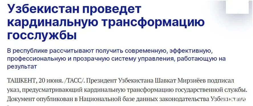 Rossiya OAV: O'zbekistonda davlat xizmatini tubdan o'zgartirish bo'yicha muhim islohotlar amalga oshiriladi