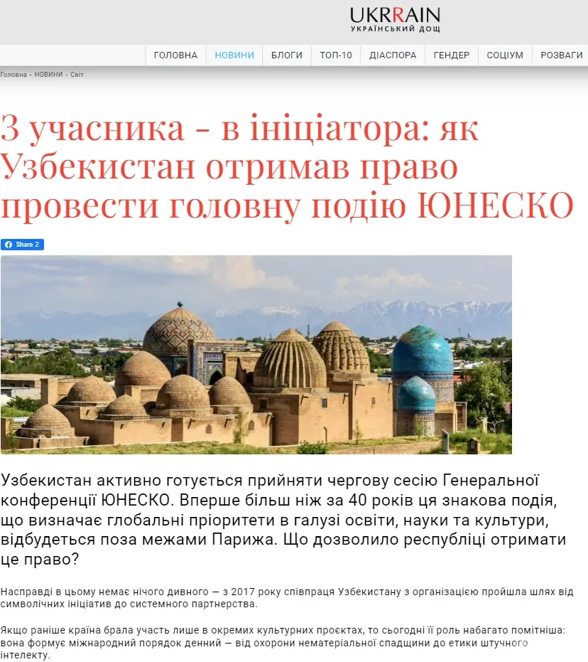 КИЕВ, 23 октябрь. /"Дунё"АА/. Украинанинг оммабоп "Український Дощ" нашрида "Иштирокчидан ташаббускорга: Ўзбекистон ЮНEСКОнинг бош тадбирини ўтказиш ҳуқуқини қандай қўлга киритди" сарлавҳали мақола эълон қилинди, деб хабар қилмоқда "Дунё" АА мухбири.