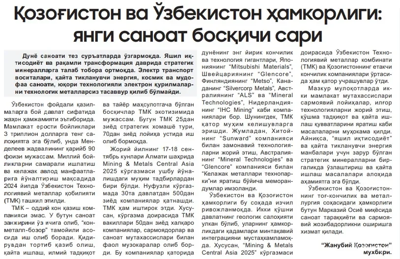 "Жорий йилнинг 17-18 сентябрь кунлари Олмаота шаҳрида "Mining & Metals Central Asia 2025 кўргазмаси ушбу йўналишдаги муҳим тадбирлардан бири бўлди. Нуфузли кўргазмада ТМК ҳам иштирок этди. Хусусан, кўргазма доирасида ТМК вакиллари 50дан зиёд халқаро компаниялар, сармоядорлар ва саноат мутахассислари билан фаол музокаралар олиб борди. ТМК қатор муҳим келишувларга эришди. Жумладан, Хитойнинг "Sunward" компанияси билан замонавий технологияларни жорий этиш, Австралиянинг "Mineral Technologies" ва "Glencore" компанияси билан "Келажак металлари технопарки"ни яратиш бўйича меморандумлар имзоланди",– дея урғуланган нашрда.