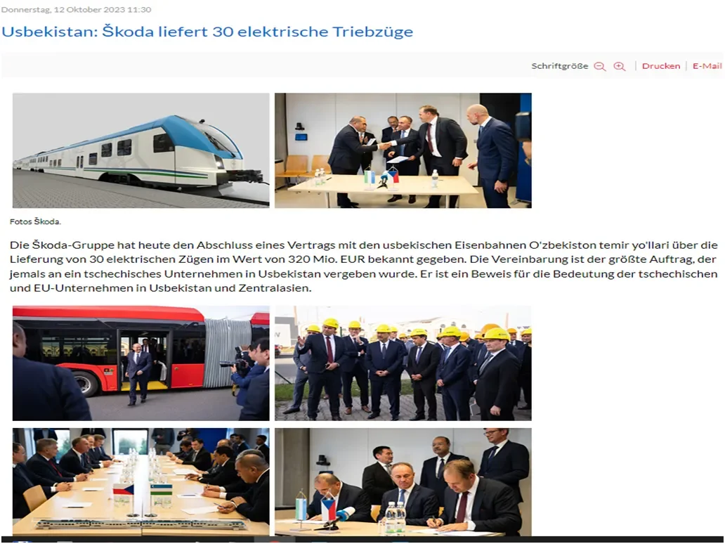 Журналнинг хабар беришича, "Skoda Group" концернининг Пльзене шаҳрида жойлашган штаб-квартирасида бўлиб ўтган шартнома имзолаш маросимида Ўзбекистон Бош вазири Абдулла Арипов, Ўзбекистон транспорт вазири Илҳом Маҳкамов ҳамда Чехия Республикаси транспорт вазири Мартин Купка иштирок этишди. Эндиликда "Skoda" компанияси "Ўзбекистон темир йўллари"га Латвия ва Эстония темир йўл операторлари томонидан ишлаб чиқарилаётган кенг калибрли электр поездларини етказиб беради. Буюртмани ишлаб чиқариш кейинги йили амалга оширилади. Лойиҳа Чехия банклари томонидан EGAP суғурта экспорт агентлиги кўмагида молиялаштирилади.