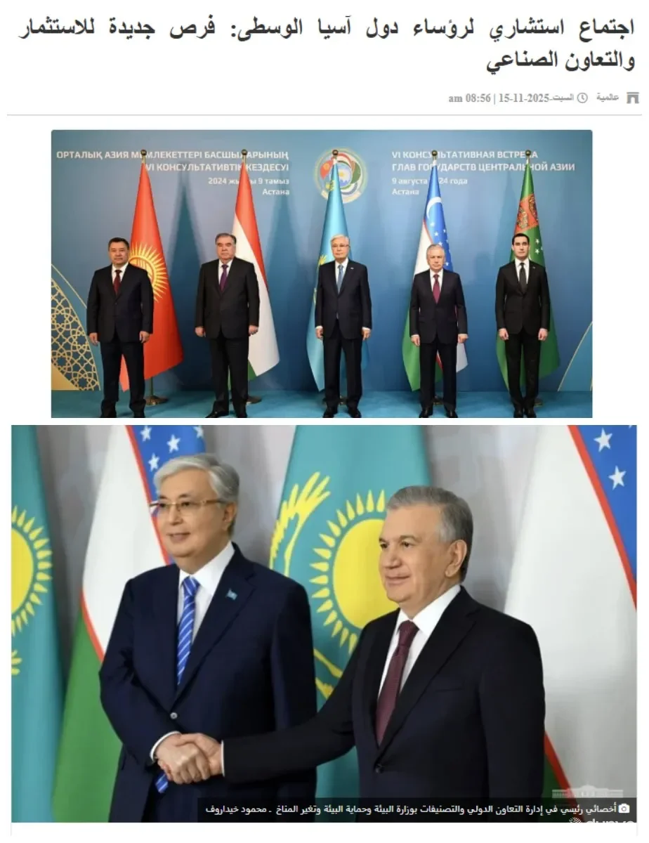 Жумладан, Иорданиянинг "Nayrouz" ҳамда Саудия Арабистонининг "Nabd al Hadath" нашрларида эълон қилинган мақолаларда Марказий Осиёдаги янгиланган ҳамкорлик модели, Ўзбекистоннинг минтақавий интеграция жараёнларидаги фаол роли ҳамда иқтисодий ва экологик барқарорлик бўйича амалий ташаббуслари кенг ёритилди. Мақола муаллифлар таъкидлаганидек, еттинчи маслаҳат учрашувлари минтақанинг умумий саноат сиёсати, инвестицион муҳити ва логистика занжирларини ривожлантиришда асосий механизмга айланди.