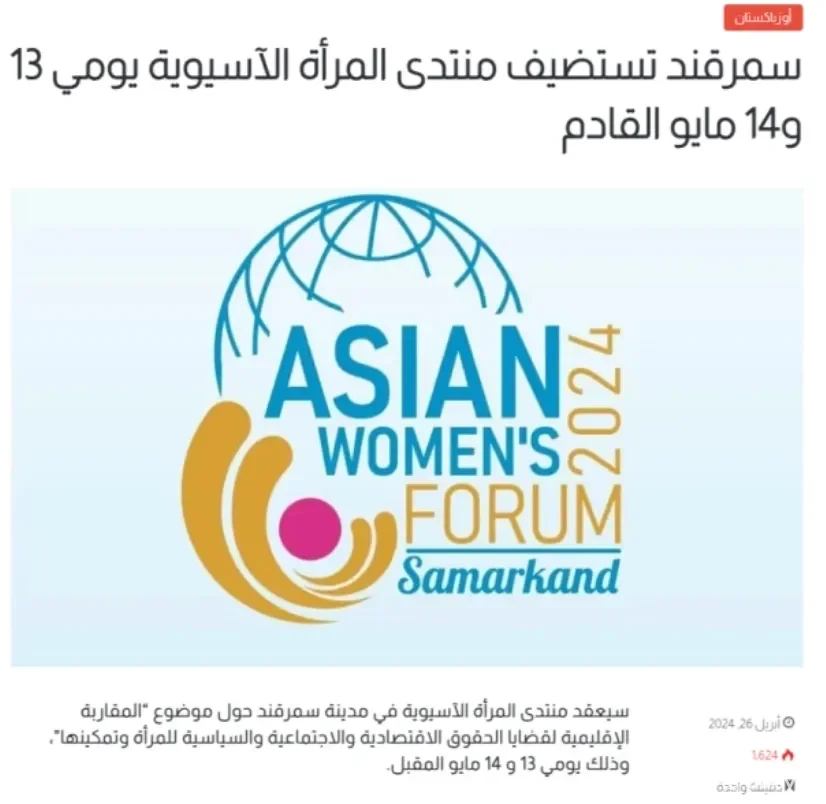 АЛ-КУВАЙТ, 28 апрель. /"Дунё" АА/. Кувайтнинг "Q8 Press" оммабоп электрон нашрида Самарқандда бўлиб ўтадиган Осиё хотин-қизлари форумига бағишланган мақола эълон қилинди, деб хабар бермоқда "Дунё" АА мухбири.