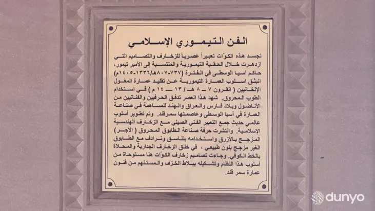 Масжид айвонида Темурийлар давлати ва меъморчилигига тавсиф берилган лавҳа ўрнатилган. Ушбу лавҳада ёзилишича, “Бу токча (ниш)лар, Темурийлар даврида гуллаб-яшнаган безаклар ва дизайнларнинг замонавий ифодасини акс эттиради. Бу дизайнлар 737–807 ҳижрий йиллар/1336–1405 милодий йиллар оралиғида Марказий Осиёнинг ҳукмдори Амир Темурга тегишли бўлиб, унинг даврига хосдир.