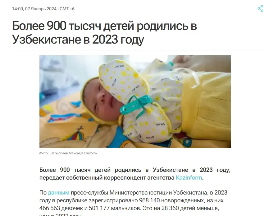 ОСТОНА, 10 январь. /«Дунё» АА/. Қозоғистоннинг «Казинформ» халқаро ахборот агентлиги «2023 йилда Ўзбекистонда 900 мингдан ортиқ бола туғилди» сарлавҳали мақолани тарқатди, деб хабар бермоқда «Дунё» АА мухбири.