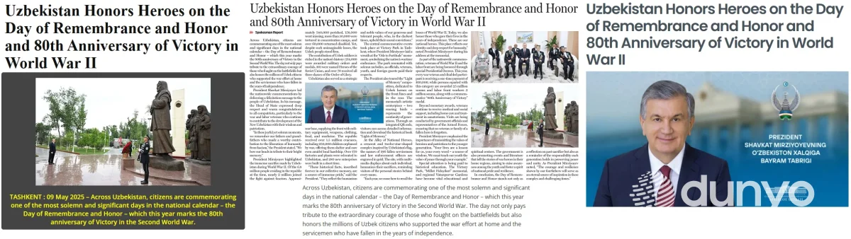 "Ўзбекистон 9 май – Хотира ва қадрлаш кунини нишонламоқда. Жорий йилда бу сана Иккинчи жаҳон урушидаги Ғалабанинг 80 йиллигига тўғри келмоқда. Ушбу кун нафақат жанг майдонларида жасорат кўрсатганларга, балки уруш даврида фронт ортида машаққат билан меҳнат қилган миллионлаб ўзбек фуқароларига, ва мустақиллик йилларида ҳалок бўлган ҳарбийларга ҳурмат бажо келтириш кунидир" – дея бошланган мақолалар.