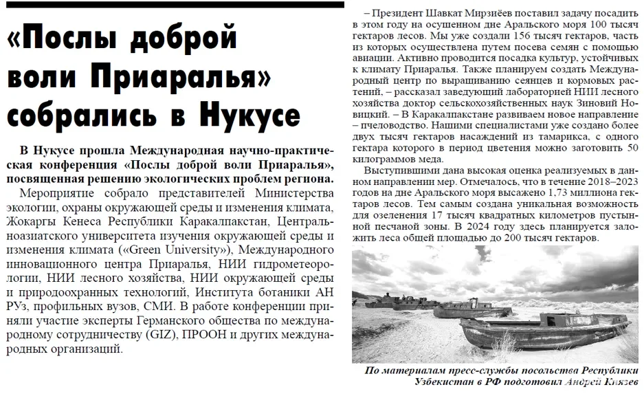 Мақола якунида "2018–2023 йилларда Орол денгизи тубида 1 миллион 730 минг гектар ҳудудда ўрмон плантациялари ташкил этилиб, 17 минг квадрат километр майдон кўкаламзорлаштирилганини маълум қилган. 2024 йилда эса жами 150-200 минг гектар майдонда ўрмонлар барпо этиш режалаштирилган. Ушбу чора-тадбирлар иштирокчилар томонидан юқори баҳоланди", – деб ёзган "Мир новостей".