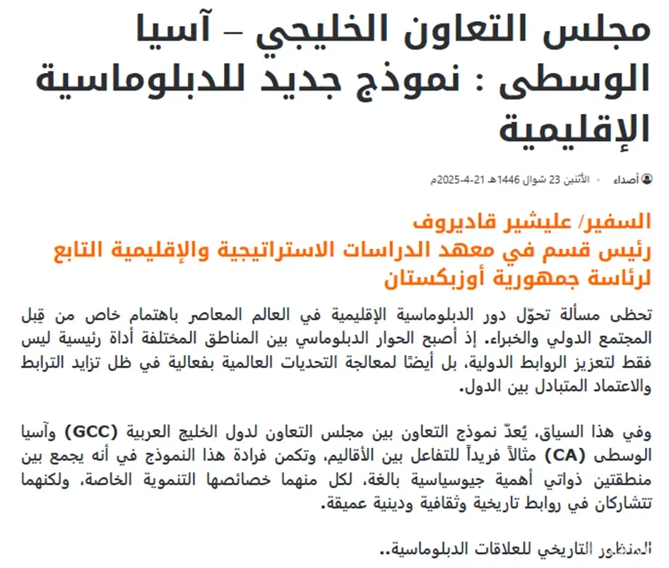 "Марказий Осиё – Кўрфаз араб давлатлари ҳамкорлик кенгаши" формати нафақат икки минтақанинг ривожи учун, балки кенг геосиёсий маконда барқарор тараққиётни таъминлашда муҳим омил", деб ёзилган "Asdaaoman" газетасида чоп этилган мақолада.