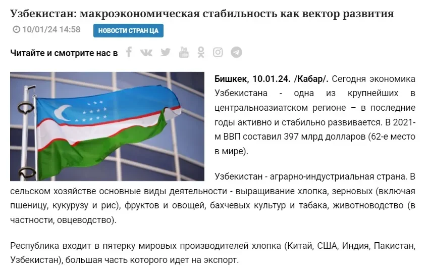 БИШКЕК, 11 январь. /«Дунё» АА/. Қирғизистоннинг «Кабар» миллий ахборот агентлиги Ўзбекистон Президенти ҳузуридаги Қонунчилик ва ҳуқуқий сиёсат институтининг етакчи илмий ходими Фирдавс Сафаровнинг «Ўзбекистон: макроиқтисодий барқарорлик – ривожланиш вектори» сарлавҳали мақоласини эълон қилди, деб хабар бермоқда «Дунё» АА мухбири.