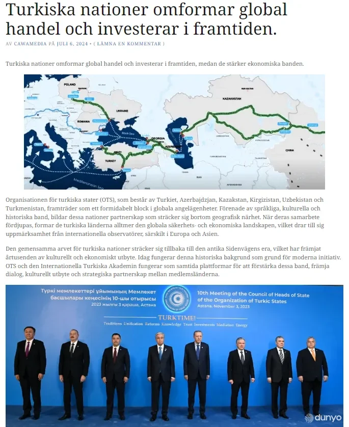 СТОКГОЛЬМ, 11 июль. /"Дунё" АА/. Швециянинг "Cawa Media" нодавлат ахборот агентлиги "Туркий давлатлар халқаро савдони ўзгартирмоқда ва келажакка инвестиция киритмоқда" сарлавҳали мақолани тарқатди, деб хабар қилмоқда "Дунё" АА мухбири.