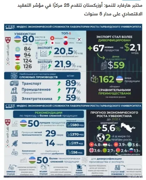 "Мазкур рейтингда Ўзбекистон сўнгги 5 йил ичида 25 поғона юқорилаб, 145 та мамлакат орасида 80-ўринни эгаллаб, Иқтисодий мураккаблик рейтингида ўз мавқеини сезиларли даражада яхшилади. Мамлакат иқтисодиёти барқарор ўсишни кўрсатмоқда, экспорт йилига ўртача 20,5%га ўсди, бу минтақадаги мамлакатларининг бошқа мамлакатларидаги ўсиш суръатларидан анча юқори", – деб таъкидланган материалда.