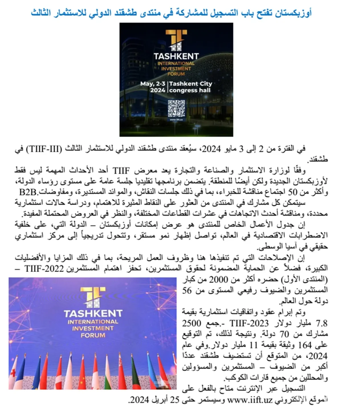 Нашрларда жорий йилнинг 2-3 май кунлари III Тошкент халқаро инвестиция форуми (TХИФ-III) бўлиб ўтиши маълум қилинган