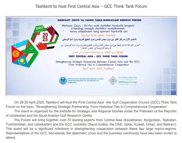 Маълум қилинганидек, шу йилнинг 28-29 апрель кунлари бўлиб ўтадиган тадбир Ўзбекистон Президенти ҳузуридаги Стратегик ва минтақалараро тадқиқотлар институти ҳамда Саудия Арабистонининг "Gulf Research Center" тадқиқот маркази томонидан ташкил этилмоқда.