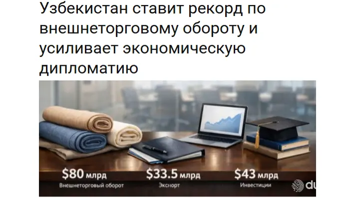 Материалда ёзилишича, 2025 йилда Ўзбекистоннинг ташқи савдо айланмаси илк бор 80 миллиард доллардан ошган. Йил якунларига кўра, экспорт ҳажми 33,5 миллиард долларга етиб, хорижий инвестициялар оқими 43 миллиард доллардан ортган.