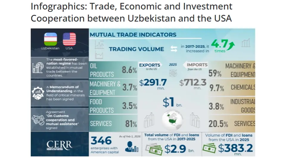 “2017–2025 йиллар давомида Ўзбекистон ва АҚШ ўртасидаги товар айирбошлаш ҳажми 4,7 баробарга ошиб, 215 миллион доллардан 1 миллиарда долларга етди. Экспорт ҳажми 9,1 баробарга ўсиб, 32,1 миллион доллардан 291,7 миллион долларга, импорт эса 3,9 баробарга ошиб, 182,9 миллион доллардан 712,3 миллион долларга етди. Ушбу давр мобайнида Ўзбекистон ташқи савдосида АҚШ улуши ҳам ўсди: умумий товар айирбошлаш ҳажмида 0,8 фоиздан 1,2 фоизга, экспортда 0,3 фоиздан 0,9 фоизга, импортда эса 1,3 фоиздан 1,5 фоизга кўтарилди”, –дейилган манбаларда.