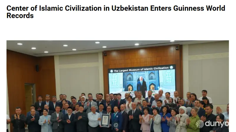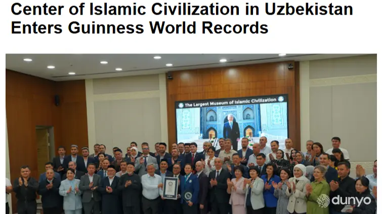 • 65ИСЛОМОБОД, 18 апрель. /“Дунё” АА/. Покистоннинг “The Diplomatic Insight” журнали, “Infora News” ва “The Gulf Observer” Ўзбекистондаги Ислом цивилизацияси маркази “Guinness World Records” томонидан Гиннеснинг рекордлар китобига киритилгани ҳақида мақолаларни эълон қилди, деб хабар бермоқда “Дунё” АА мухбири.