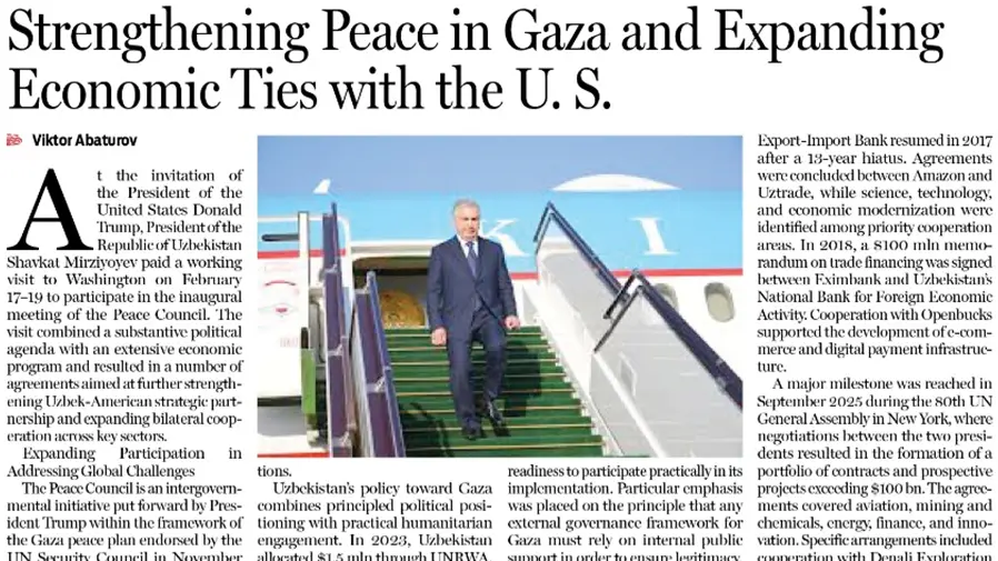 «Президент Шавкат Мирзиёев АҚШ Президенти Дональд Трампнинг таклифига биноан 17–19 февраль кунлари Вашингтон шаҳрига ишчи ташриф билан бориб, Тинчлик кенгашининг биринчи саммитида иштирок этди, – дейилади мақолада. – Ушбу ташриф доирасида Ўзбекистон ва АҚШ ўртасида иқтисодий ҳамкорликни мустаҳкамлаш бўйича ҳам муҳим келишувларга эришилди».
