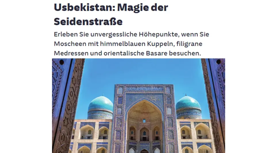 Мақолада ёзилганидек, бу заминдаги тарихий шаҳарлар - Самарқанд, Бухоро, Хивани айланиб, мовий гумбазли масжидлар, нафис мадрасалар ва гавжум бозорларни кўрасиз.