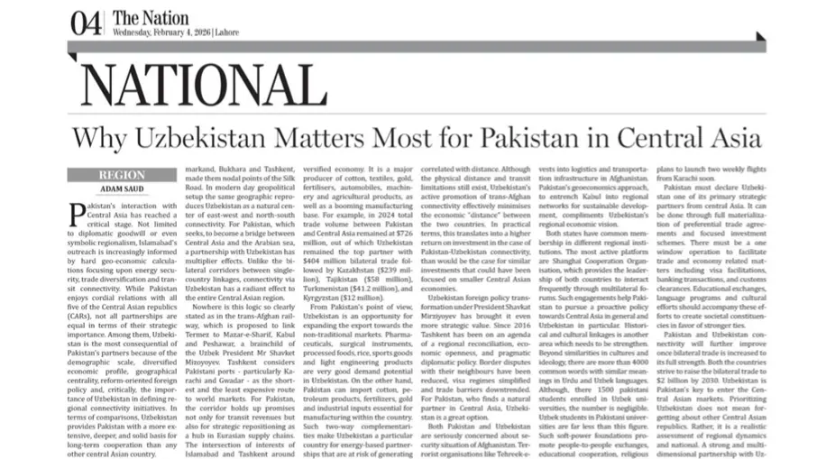 “The Nation” газетаси: Ўзбекистон билан кўп қиррали ҳамкорлик Покистонга Марказий Осиё билан тарихий алоқаларни қайта тиклаш имконини беради