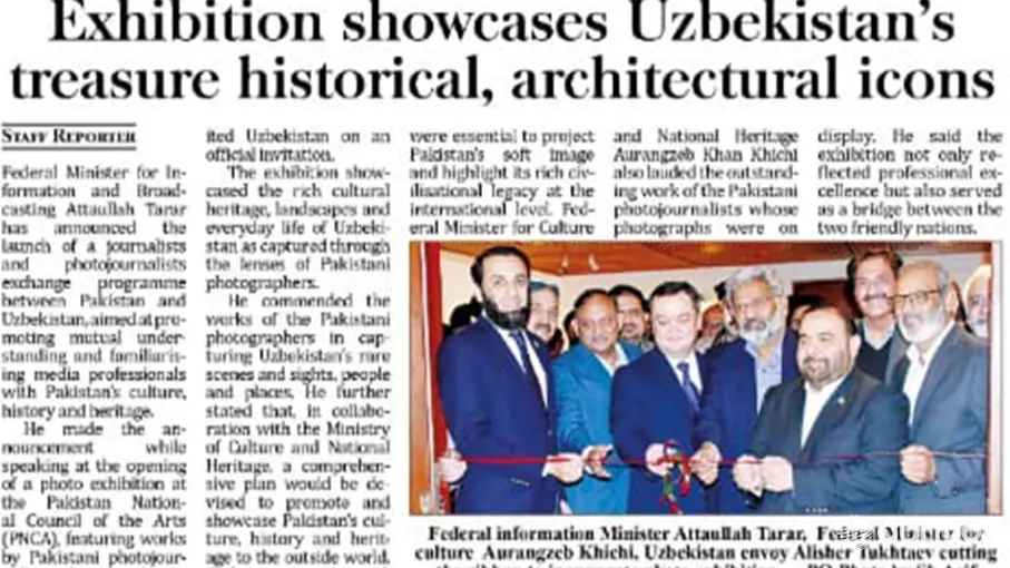 Уларда Ўзбекистон элчихонаси томонидан Покистон Миллий санъат галереясида бир гуруҳ покистонлик фотомухбирларнинг шу йил 2-7 август кунлари юртимизга амалга оширган пресс-тури якунларига бағишланган “Ўзбекистон покистонлик фотосуратчилар нигоҳида” фотокўргазмасининг очилиш маросими ва махсус фотоальбомнинг тақдимоти ташкил этилгани хабар қилинган.