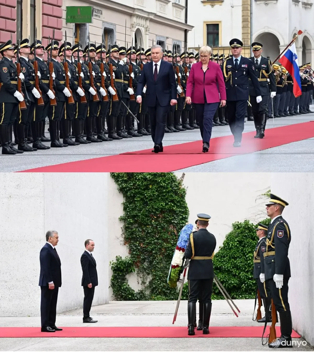 Давлатимиз раҳбари матбуот хизмати маълумотига кўра, Ўзбекистон етакчисини Словения Президенти Наташа Пирц Мусар самимий кутиб олди. Олий мартабали меҳмон шарафига фахрий қоровул сафланди. Ҳарбий оркестр Ўзбекистон ва Словения давлат мадҳияларини ижро этди.