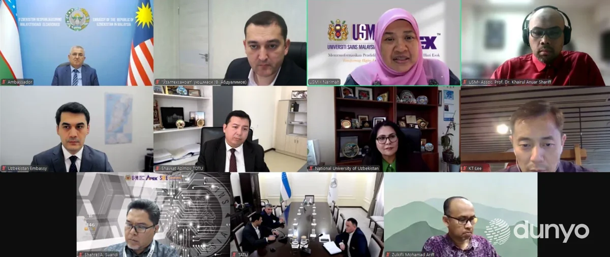 КУАЛА-ЛУМПУР, 1 март. /"Дунё" АА/. Юртимиз элчихонаси кўмагида "Ўзэлтехсаноат" уюшмаси, Малайзия фан университети (Universiti Sains Malaysia – USM), Тошкент ахборот технологиялари университети, Тошкент давлат техника университети ва Ўзбекистон Миллий университети раҳбарияти ўртасида онлайн учрашув ташкил этилди, деб хабар қилмоқда "Дунё" АА мухбири.