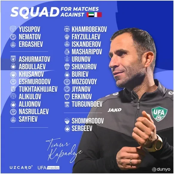 Қуйида терма жамоамиз бош мураббийи Тимур Кападзе ушбу йиғинга жалб этилган футболчилар рўйхати билан танишинг: