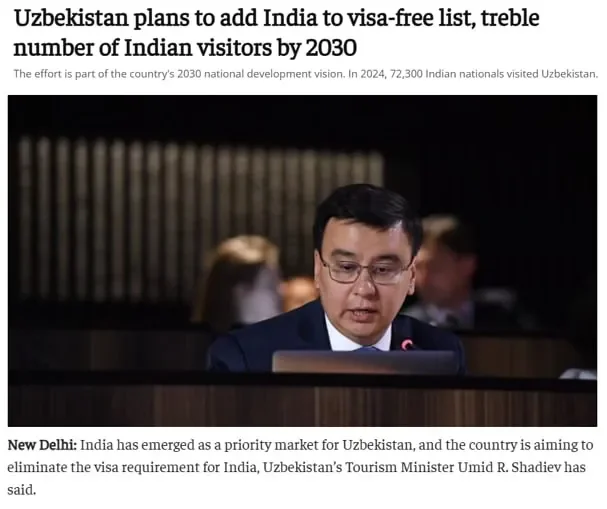 Оммабоп "The Print" нашрида чоп этилган "Ўзбекистон Ҳиндистонни визасиз тартибга эга давлатлар қаторига қўшишни режалаштирмоқда, 2030 йилга бориб ҳиндистонлик сайёҳлар сонини уч баравар оширишни режалаштирмоқда" сарлавҳали мақолада Ҳиндистон Ўзбекистон учун устувор бозорга айлангани ҳақида сўз юритилган.
