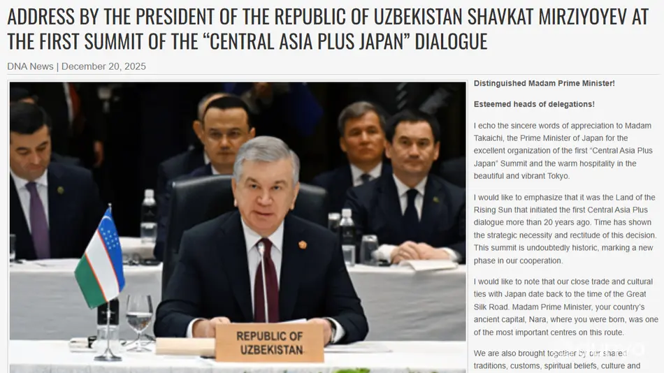 Нашрларда 20 декабрь куни Ўзбекистон Республикаси Президенти Шавкат Мирзиёев Токиода “Марказий Осиё + Япония” мулоқотининг биринчи саммитида иштирок этди ва ўз нутқида “Марказий Осиё + Япония” форматида ҳамкорликни ривожлантириш юзасидан ўз нуқтаи назарини тақдим этди.